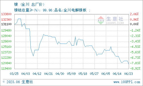 金川集团于2025年6月26日电解镍(大板)出厂价报123100元/吨,较上一交易日上调2300元/吨。